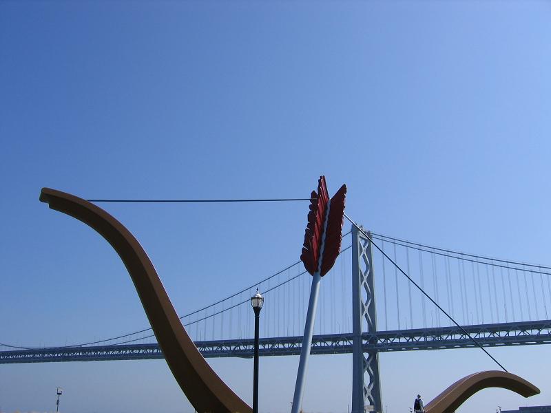Pfeil und die Oakland Bay Bridge. Von wem er wohl erfahren hat, dass hier