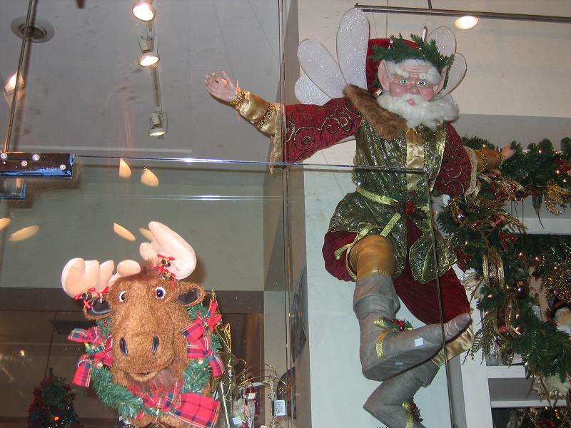 Weihnachtsmann als Elfe und ein Elch im Schaufenster. Pier 17. New York.