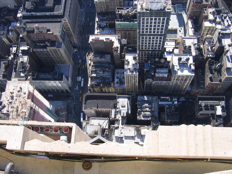 Gut zu sehen ist die Straßenschlucht links, die 5th Avenue, die ja direkt am "Fuß" des Empire State Buildings vorbeiführt. Links unten siehst Du übrigens die Scheinwerfer,die während der Feiertage die Spitze des Gebäudes in rotes Licht tauchen.