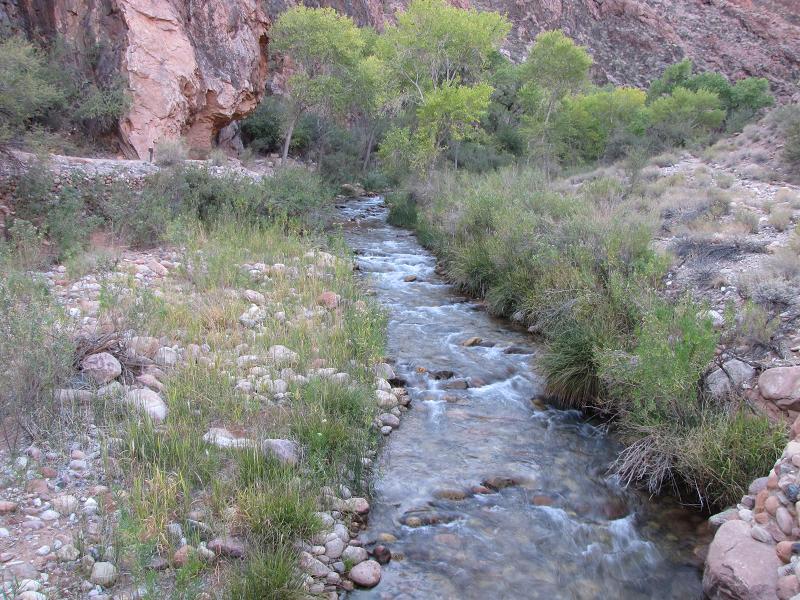 Bright Angel Creek am Abend von der Brücke zum Zeltplatz aus fotografiert.